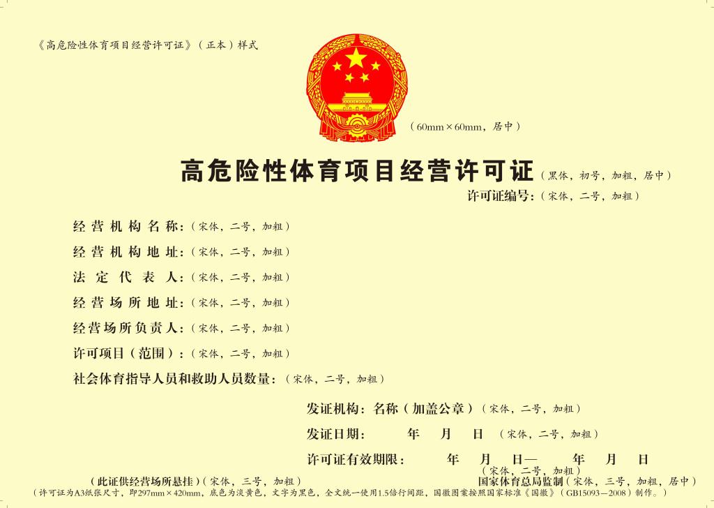 3. 经营高危险性体育项目(潜水)审批条件及程序.docx 4. 经营高危险性体育项目(攀岩)审批条件及程序.docx 5. 经营高危险性体育项目申请书.docx 6. 《高危险性体育项目经营许可证》(正本)样式.jpg 7. 《高危险性体育项目经营许可证》(副本)样式.jpg 8. 高危险性体育项目经营许可证样式说明.docx |