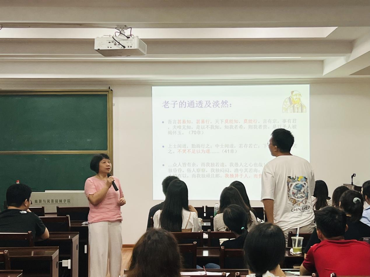 江晓云副教授先从老子的语录为切入点,与学生进行了课堂互动,通过水的各种形态、水的特质,让同学们了解老子的通透与淡然。江老师从“道”、“德”、“经”三个方面进行解读,向同学们讲述了儒道两家对“道德”的侧重。随后,江老师分享了《道德经》中的管理启示,虚实结合,引经据典,把管理艺术、管理哲学讲得生动具体。最后江晓云副教授引用北宋理学家张载的“为天地立心,为生民立命,为往圣继绝学,为万事开太平”四句话送给全体同学,并希望同学们学习好管理知识,拥有知识分子的情怀。