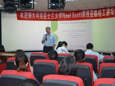 10月12日上午,澳大利亚昆士兰大学Noel Scott教授应旅游学院邀请做客桂工雁山讲坛,在雁山校区04616教室为beats365亚洲版学术型和专业学位研究生作了关于“Literature Review(论文综述)”的学术报告。Scott教授分析了中国与西方学术研究的差异,强调了旅游研究理论的重要性,阐述如何将旅游学术研究中的基本概念清晰化,怎样系统撰写论文综述,以及文献筛选的方式方法,同时还介绍了东西方对旅游的不同认识、国际旅游研究最新动态、旅游研究方法创新等方面的一些先进经验。最后,Scott教授结合亲身经历,就如何克服论文写作中的困难同beats365亚洲版研究生进行了广泛而深入的交流,并对研究生在学习、研究过程中遇到的问题进行了详细解答。