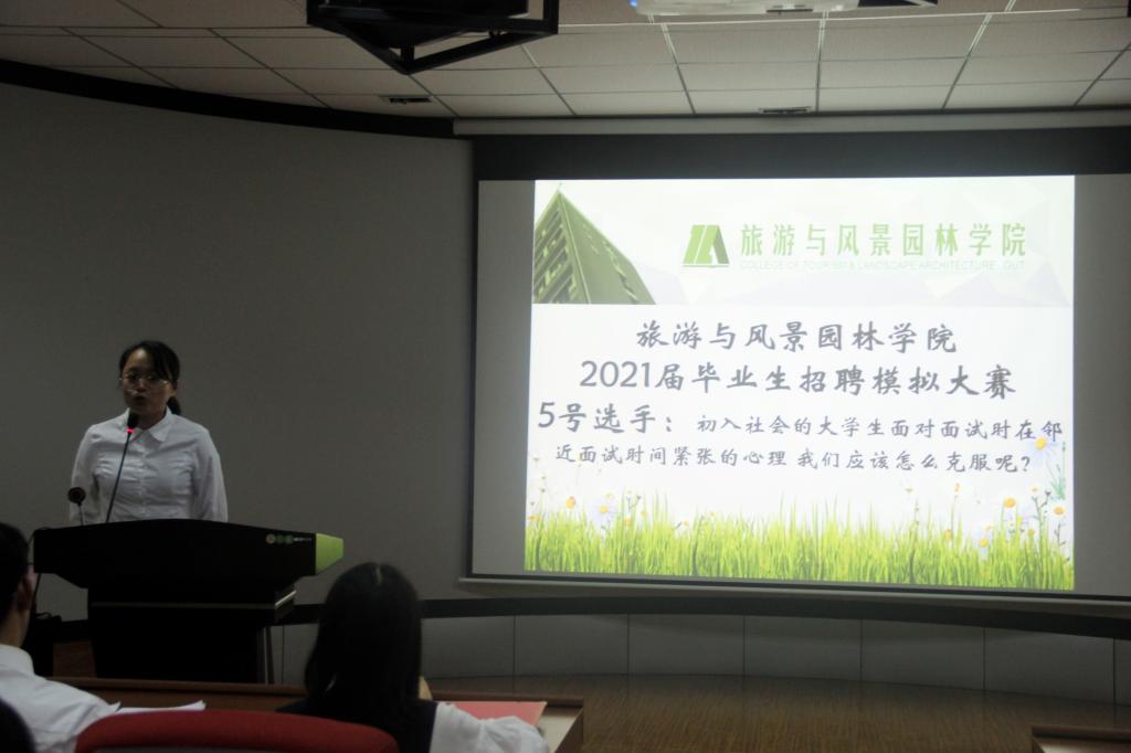 为积极引导毕业生就业,精准推进毕业生就业服务工作,切实提高2021届学生的求职面试技巧,增加求职面试经验,提高简历制作水平。经过前期的筹划与准备,在各班开展招聘模拟大赛决赛基础上,旅游与风景园林学院于2021年9月28日晚在04616教室举办校园招聘模拟大赛决赛,决赛选手共10位。学院唐兰老师、黄苏宁老师、研究生代表担任评委。