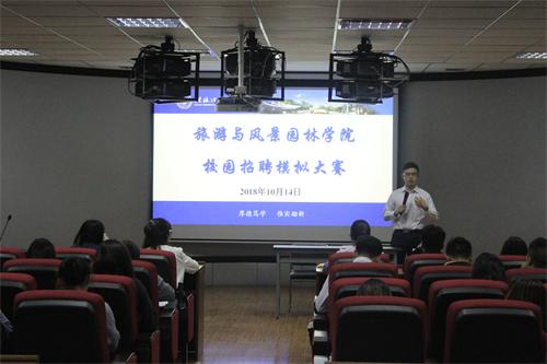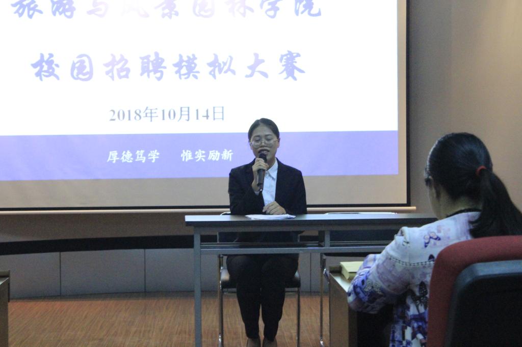 为提高2019届级学生的求职面试技巧,增加求职面试经验,学院组织各班开展校园招招聘模拟大赛初赛。经过班级选拔,旅游与风景园林学院于2018年10月14日晚7点30分在04616教室举办校园招聘模拟大赛决赛,决赛选手共11位。学院黄小华老师以及2015级各班的班委代表担任评委。