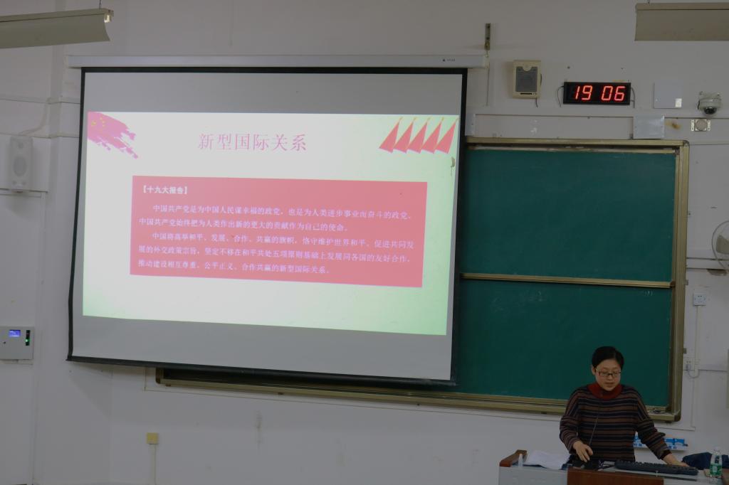 课堂上,叶婷老师紧紧围绕着党的十九大报告的观点和战略,条例清晰、语言生动地讲述了“人类命运共同体”思想与“一带一路”倡议问题,并结合视频讲解,带领学生们了解了什么是新型国际关系,以及“一带一路”倡议将如何影响到自身生活和发展等问题。