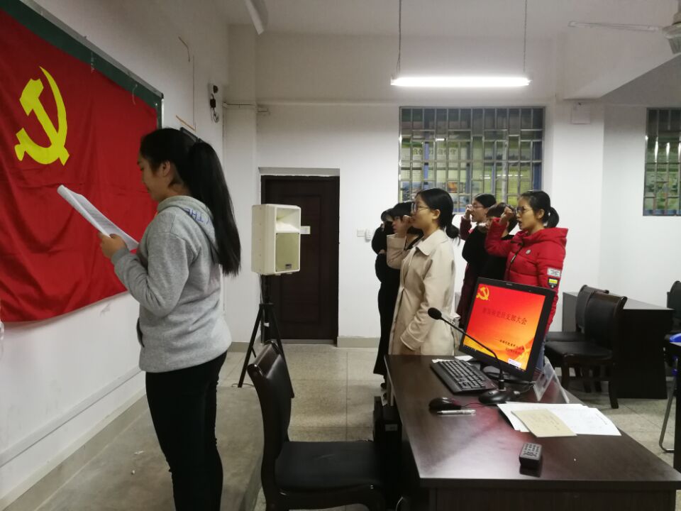 会议一直遵守严格的发展和转正程序,保持了和谐融洽的氛围。会上,首先由发展对象针对自己对党的认识、入党动机、本人现实表现情况及需向党组织说明的问题进行汇报。接着,由入党介绍人介绍发展对象有关情况,并对其能否入党表明意见。在汇报人回避的情况下,其他党员介绍发展对象的有关情况。随后,支部委员会报告了对发展对象的审查情况,宣读了支部考察意见,并当场根据大会讨论记录的结果,对各位发展对象的不足之处提出了希望与要求。经过无记名投票表决,七位拟发展为预备党员的同志全票通过。最后,全体党员起立,面对党旗,庄严宣誓,诵读入党誓词,七位通知正式被吸收为预备党员,成为我支部的新鲜血液。