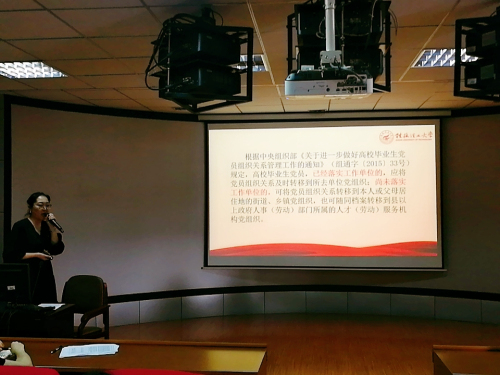 为加强毕业生党员的党务知识,也为了确保2019届毕业生党员党组织关系转移工作顺利完成,5月24日下午15:00,beats365亚洲版在雁山校区04616教室开展了“党组织关系接转工作的理论与实务”的实务知识培训,此次培训由学院分党校教务员张露萍老师主讲,全体2019届毕业生党员约85人参加了此次培训。