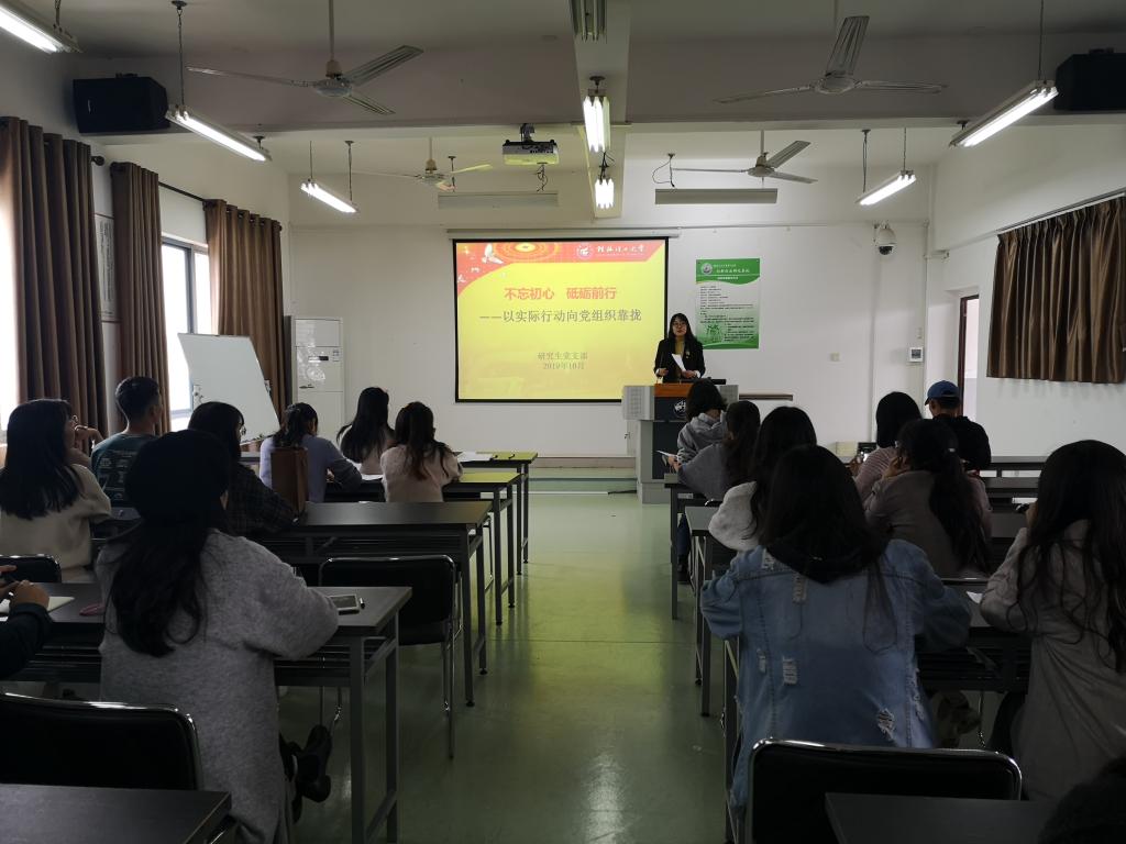 张老师围绕《广西党员发展工作手册》中的入党流程这一主题为全体党员、入党积极分子上了一堂生动形象、激励人心的党课。她讲到要从思想上让入党成为一生的追求,根据党章的要求、义务、责任,严格要求自己,争取实现从思想观念上发生质的蜕变,并落实到日常的学习生活中。她还指出,作为一名入党积极分子,要明晰入党流程,严肃认真的完成好每一个环节,按时上交材料,不做临时工。同时,张老师还阐述了作为新时代的优秀研究生,既要耐住寂寞搞学术,也要眼观八方觅前程,要树立远大理想和崇高信念,坚定不移的向前冲,要时刻牢记使命,求真务实,把自身的梦想与国家民族的梦想结合起来,为祖国的发展而奋斗。
