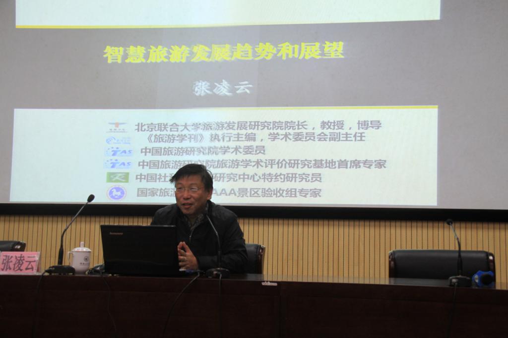 12月12日下午,应旅游学院邀请,北京联合大学旅游学院博士生导师张凌云教授在雁山校区图书馆报告厅为我校师生做了题为“智慧旅游发展趋势和展望”的学术报告。该主题报告是“旅游学院成立30周年暨旅游教育发展学术研讨会”的重要内容之一。报告会由旅游学院吴忠军院长主持,该院相关领导、教师、各专业学生以及出席学院成立30周年大会的部分校友,共计200多人聆听了报告。