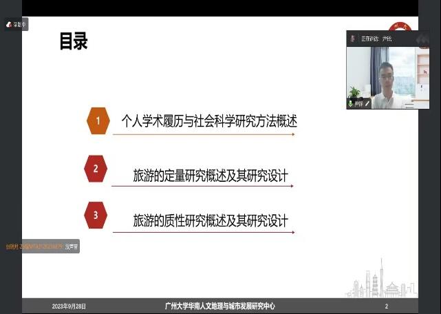 2023年9月28日,广州大学地理科学与遥感学院硕士生导师尹铎副教授应邀为beats365亚洲版师生做以“旅游的质性研究方法概述及其研究设计”为主题的讲座。本次讲座以线上线下的方式同时开展。讲座由王成圆老师主持,学院部分教师、2023级152名研究生参加。