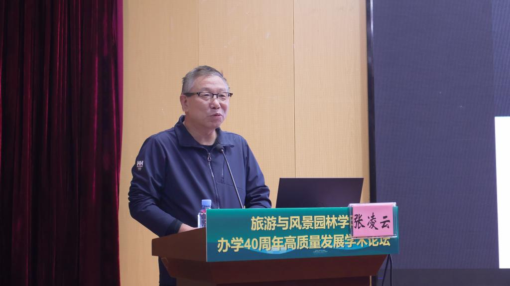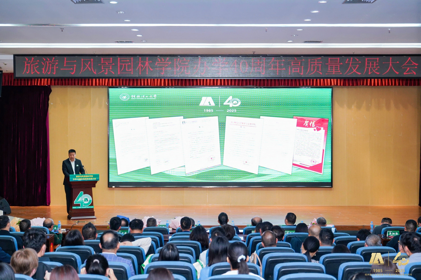 桂林旅游学院原校长、旅游与风景园林学院原院长程道品在大会发言。他深情回顾了在学院的工作经历,表达了对学院的深厚情谊与未来蓬勃发展的期许。