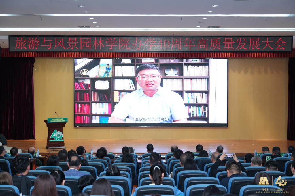 中山大学教授、中国旅游协会旅游教育分会会长保继刚通过视频方式致辞。他深情回顾了与学院的深厚渊源,并对学院四十年来的跨越式发展表示祝贺。