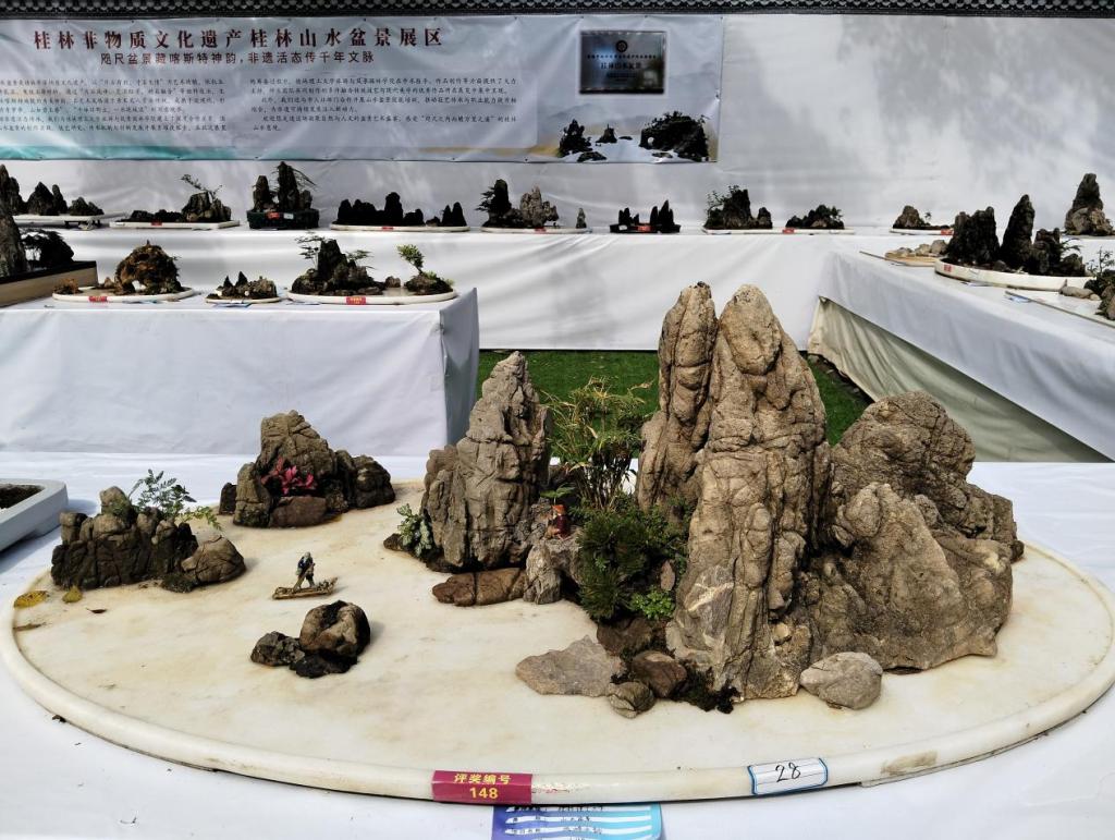 桂林山水盆景是桂林市非物质文化遗产,以“片石有致、寸石生情”为艺术精髓,依托本地特有的钟乳石、龟纹石等材料,通过“片石成峰、灵活组景、树石融合”等独特技法,生动再现桂林喀斯特地貌的秀美神韵。其艺术风格源于唐宋文人赏石传统,成熟于近现代,形成了“江作青罗带,山如碧玉簪”“千峰环野立,一水抱城流”的写意境界。