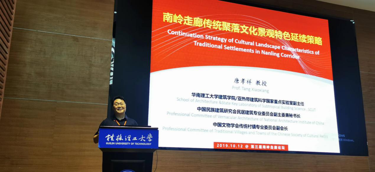 华南理工大学建筑学院唐孝祥教授作了题为《南岭走廊传统聚落文化景观特色延续策略》的主题报告。在报告中唐孝祥教授指出南岭走廊地区我国是至今传统聚落保存最好、数量最多、最具历史风貌和地域特色的区域之一,其传统聚落,历史悠久,文化深厚,形态多样,特色鲜明,价值丰赡是建筑美学研究和风景园林美学研究的重要对象;分析了南岭走廊的传统聚落文化景观价值,总结出了历史价值深厚、文化价值丰富、科学价值突出、艺术价值多彩四个特点;提出了南岭走廊传统聚落文化景观审美的适应性特征包括三个方面:自然适应性、社会适应性和人文适应性。自然适应性是指传统聚落对气候、地理以及本土材料的适应性,通过传统聚落文化景观的营造,一方面满足传统村落的功能需求,另一方面有增加传统聚落的自然环境的居住价值和景观价值;社会适应性特征是指传统聚落及其文化景观作为一种文化现象,传达出特定时代的社会理性,记录社会变迁、反映社会思潮、折射出对特定历史时期的政治、经济、军事等生产生活方式的适应性;而传统聚落的人文适应性是聚落发展和追求的目标,决定传统聚落的丰富性和差异性。通过隐喻和象征手法,体现南岭传统聚落的价值观、思维观、宗法观、环境观和审美观;认为目前南岭走廊传统聚落的文化景观保护存在以下三种问题:1.传统聚落风貌保护问题突出;2.传统聚落空心化问题堪忧;3.文化传承问题任重道远;并针对目前南岭走廊传统聚落的文化景观保护现状与问题,对南岭走廊传统聚落文化景观的提出了三点保护思路与策略:1.强调因地制宜,传承地域技术特征;2.体现时代理性,彰显社会时代精神;3.展现文化特色,弘扬人文艺术品格。