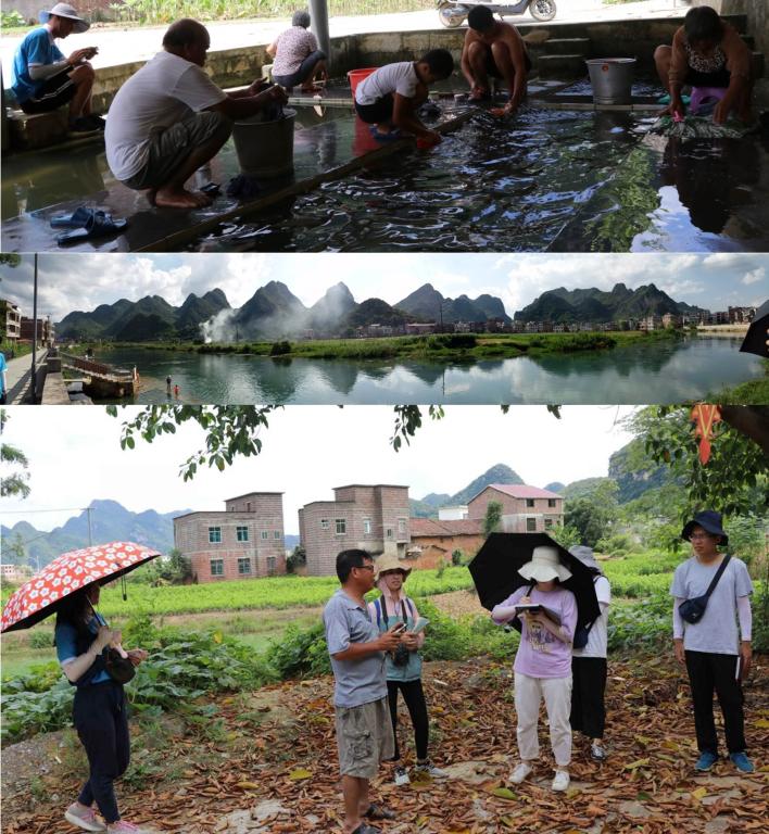 7月28日下午6时,三里至古蓬的调查结束。在7月26日-28日的三天里,实践队在指导老师带领下,调查发现三里镇至古蓬镇30公里线路上的三里歌圩、南丹卫遗址、清秀山遗址、汇水河石刻和滂江两岸古八寨壮族乡村等丰富深厚的历史遗存,壮族特色乡村文创旅游发展潜力巨大。其中,滂江起源处的古蓬内联村淩滂、淩从两大天然水域水质明净清凌,沿岸风光秀丽,乡村星罗棋布,古道古桥穿梭往来,徐霞客从三里古镇北上穿越古蓬八寨,于红水河罗墨渡北去贵州云南,遗存有大量考察笔记内容,另有“八寨起义”、“古思起义”等红色文化、八寨文化、壮族文化、土司文化和军屯文化等内容。为详细了解滂江沿岸壮族传统建筑样式,实践队还深入古蓬深山,重点考察了壮族传统文化生态保护村天马屯,受到当地村民的热烈欢迎,离别时已是黄昏,双方互赠礼物以表达情意。