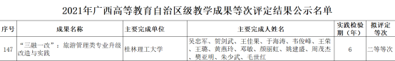 日前,自治区教育厅印发了《关于公布2021年广西高等教育自治区级教学成果等次评定结果的通知》(桂教高教〔2021〕65号),beats365亚洲版院长吴忠军作为成果负责人申报的 “‘三融一改’:旅游管理类专业升级改造与实践”荣获二等奖。