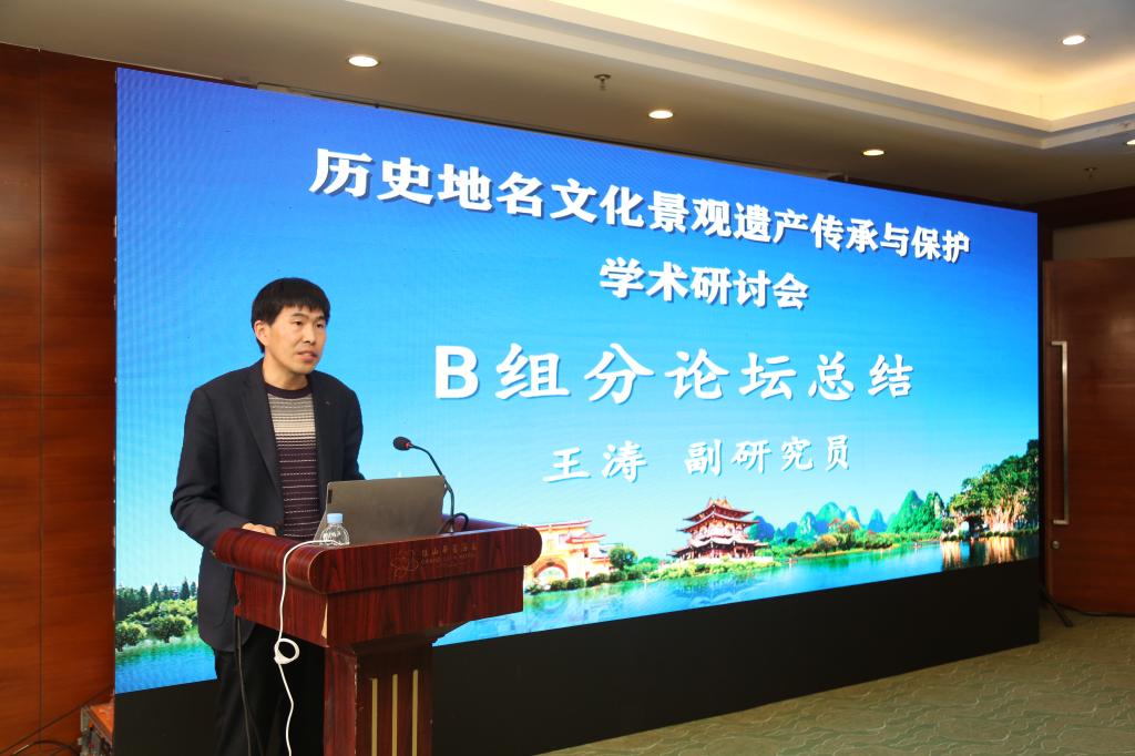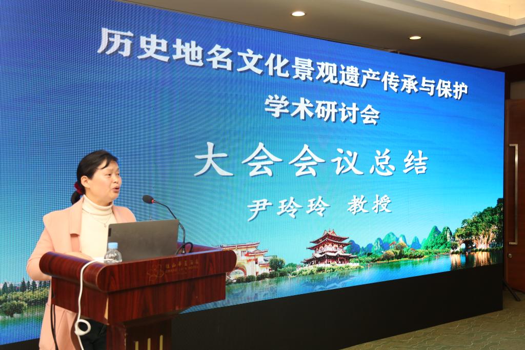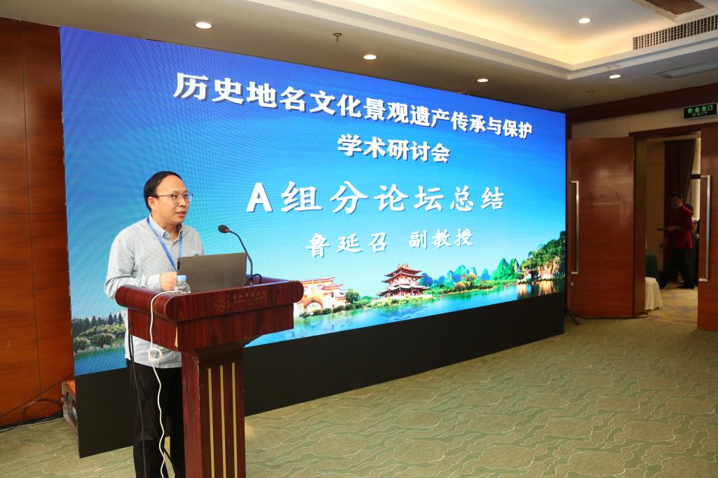 在小组讨论总结环节,河南理工大学副教授鲁延召对“历史地名更名、演变与启示”小组讨论总结道:参会论文使用典型历史地理研究方法,研究视角多样,理论丰富,研究内容涵盖行政地名、军事、景观、河流地名等。并建议拓展“八景”为“十景”。江西省社科院王涛副研究员将“地名文化遗产景观保护传承与多学科价值”小组讨论总结为:现有历史地名文化研究将理论和实践相结合,体现了学者强烈的社会责任和家国情怀。上海师范大学尹玲玲教授在会议总结中指出,目前历史地名学发展初具规模,研究表现出多重层次、宏观总结和微观实证相结合的特点。对桂工硕士培养工作表示高度肯定和赞赏。
