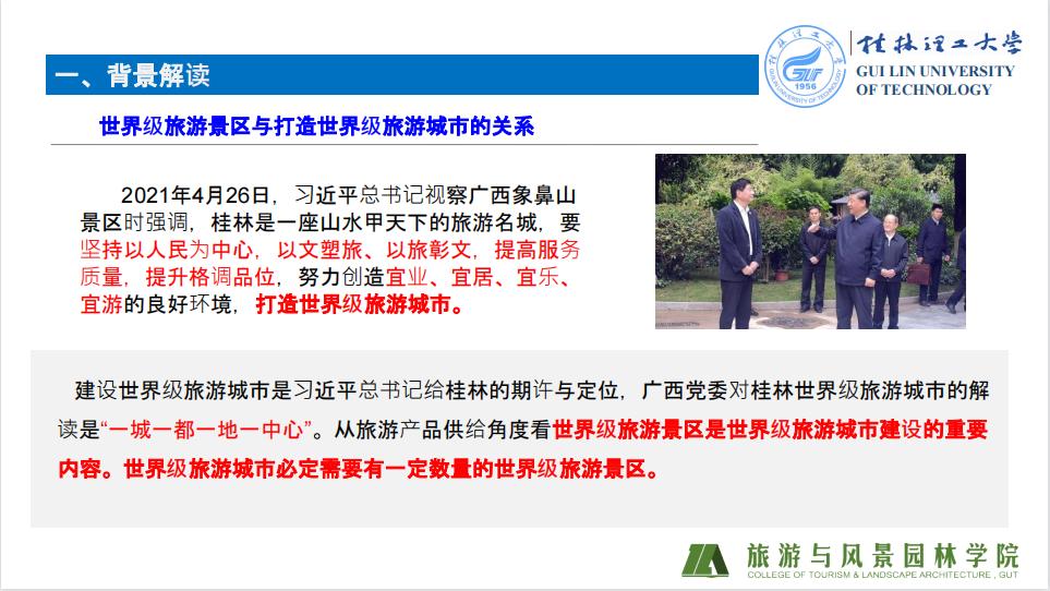 吴忠军教授分析了当前对于世界级旅游景区建设的方针政策,介绍了世界级旅游景区的这个说法是从何而来以及打造世界级旅游城市的理由,吴忠军教授指出,十九届五中全会中首次提出了“推动文化和旅游融合发展,建设一批富有文化底蕴的世界级旅游景区和度假区”,之后国务院下发国发文件将这一目标进一步明确,吴忠军教授指出从中央到国务院都重视对世界级旅游景区的建设,关于这一目标在《“十四五”文化和旅游规划》和《“十四五”旅游业发展规划》中进一步得到细化,2021年4月份习近平总书记在广西桂林视察时提出建设世界级旅游城市,广西党委将习近平主席的讲话要求进一步细化提出“一城一都一地一中心”的发展定位。