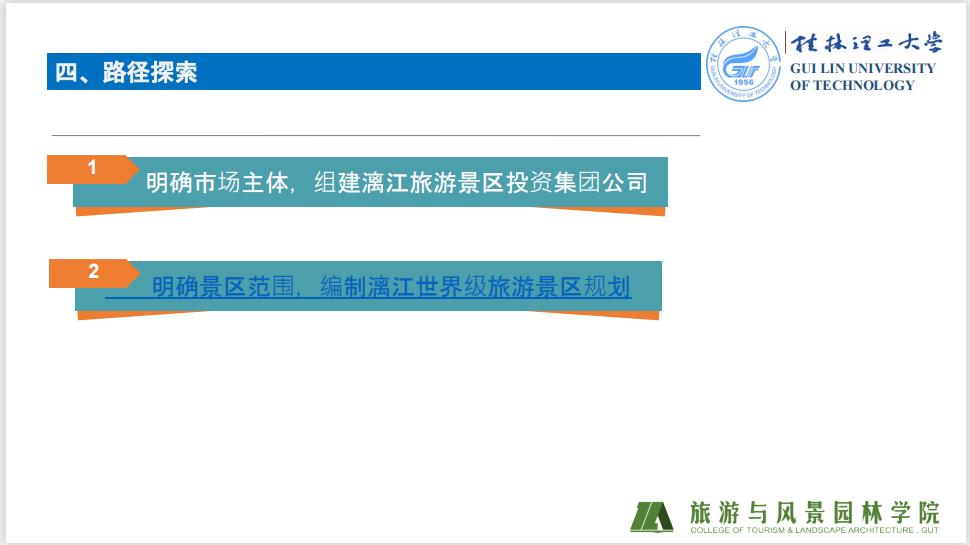 首先,明确市场主体,组建漓江旅游景区投资集团公司。第二,要明确景区范围,编制漓江世界级旅游景区规划。第三,要深入挖掘展示漓江旅游资源承载的文化内涵及价值,用文化之光点亮漓江旅游。第四,强化景区科技应用水平,加快推进以数字化、网络化、智能化为特征的智慧旅游景区建设。第五,要开发漓江沉浸式体验产品,形成水陆空旅游产品立体空间体验格局。第六,要完善漓江基础设施,提升服务质量。第七,要加强漓江旅游景区品牌建设。第八,要树立旅游为民理念,改善两岸农村环境,扶持村集体旅游产业振兴。第九,要深入落实“两山”理念,保护漓江生态环境,建设世界级人居环境。