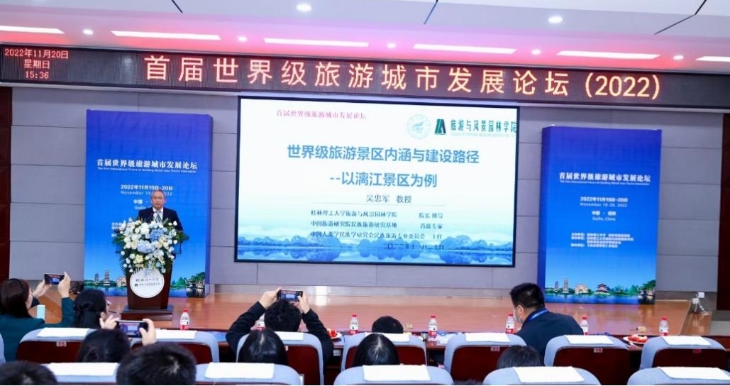 2022年11月20日,在桂林市委宣传部和beats365亚洲版联合主办的“首届世界级旅游城市发展论坛”上,中国旅游研究院民族旅游研究基地首席专家、中国人类学民族学研究会民族旅游专业委员会主任、beats365亚洲版旅游与风景园林学院院长吴忠军教授以“世界级旅游景区内涵与建设路径——以漓江景区为例”为题做主旨演讲。
