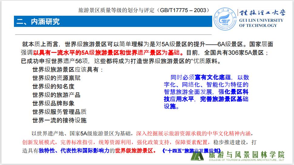 吴忠军教授指出,目前,中国没有一个完整的、科学的世界级旅游景区行动路径、实施方案、评价指标。世界级旅游景区是一个新生事物,尚无规范的学术定义。但是,2012年实施的桂林国际旅游胜地建设以及2021年4月推出的桂林世界级旅游城市建设,都属于世界级旅游目的地范畴。此外,吴教授通过从现有的研究成果给大家提供参考,一个是中国城市发展研究会在团体标准信息平台发布的《世界级旅游目的地评价标准》,贾云峰教授团队构建了反映世界级旅游目的地城市的评价指标体系,包括游客与产业经济层面、资源与吸引力层面、政策与基础配套层面、文化和可持续发展层面;一个是由世界旅游城市联合会发布的《世界旅游城市评价体系指导性文件》,文件中从旅游者、旅游产业、城市管理三个层面,构建了“综合指数—单项指数—特征指数”的三级评价体系。吴教授还指出旅游景区质量等级的划分与评定(GB/T17775–2003)中关于旅游景区的评价标准,重点提出旅游景区是具备相应旅游服务设施并提供相应旅游服务的独立管理区,强调管理区应有统一的经营管理机构和明确的地域范围。并通过比较关于5A景区与4A景区在旅游资源吸引力、市场吸引力、海内外接待游客量方面内容, 得出5A级旅游景区旅游资源吸引力和市场吸引力方面强调了“具世界意义”、“有世界级资源实体”、“世界知名”,也就是世界级,意味着5A级旅游景区其实就是世界级。AAAA级旅游景区旅游资源吸引力和市场吸引力方面强调了“具全国意义”、“有国家级资源实体”、“全国知名”也就是国家级,意味着4A级旅游景区其实就是国家级,也即世界级旅游景区可以简单理解为是对5A级景区的提升——6A级景区,吴教授通过大量的政策文件总结出,从国家层面上强调世界级旅游景区是以具有一流水平的5A级旅游景区和世界遗产景区为基础。世界级旅游景区应该具有世界级的资源禀赋、世界级的知名度、世界级的旅游产品、世界级品牌形象、世界级服务管理品质、世界一流的接待设施,同时必须富有文化底蕴,以数字化、网络化、智能化为特征的智慧旅游全面发展,强化景区科技应用水平,完善旅游景区基础设施。