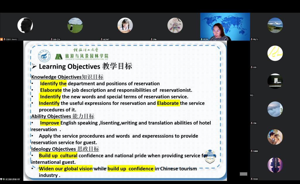 侯玉霞副教授就《旅游与酒店商务英语(中级)》进行了课程教学设计、教学目标、教学内容以及思政要素融入进行了10分钟的说课。然后,覃老师和所有教师就课程目标、课程内容、课程设计和课程思政四个方面展开了头脑风暴,并针对课程展开了热烈的讨论。