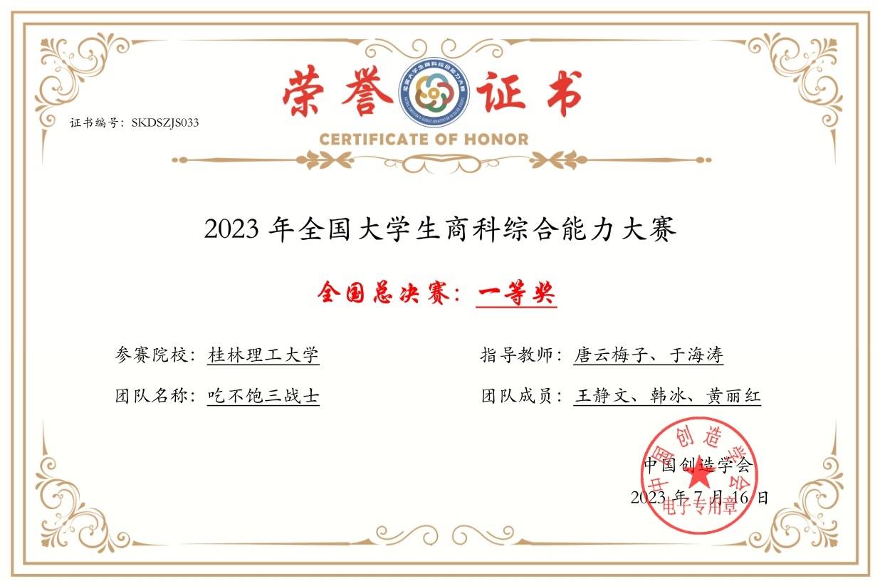 2023年7月16日,“2023年全国大学生商科综合能力大赛”全国总决赛圆满落幕。由智慧酒店管理专业唐云梅子老师与智慧旅游管理专业于海涛老师共同指导的,beats365亚洲版2020级酒店管理专业王静文同学为队长,2021级酒店管理专业韩冰与2020级旅游管理专业黄丽红同学为队员组成的参赛队伍,在比赛中表现优异,获得评委专家的一致认可,最终荣获全国总决赛一等奖。这也是智慧酒店管理专业陆云老师主讲的专业课程《收益管理》以赛促学的改革成果。