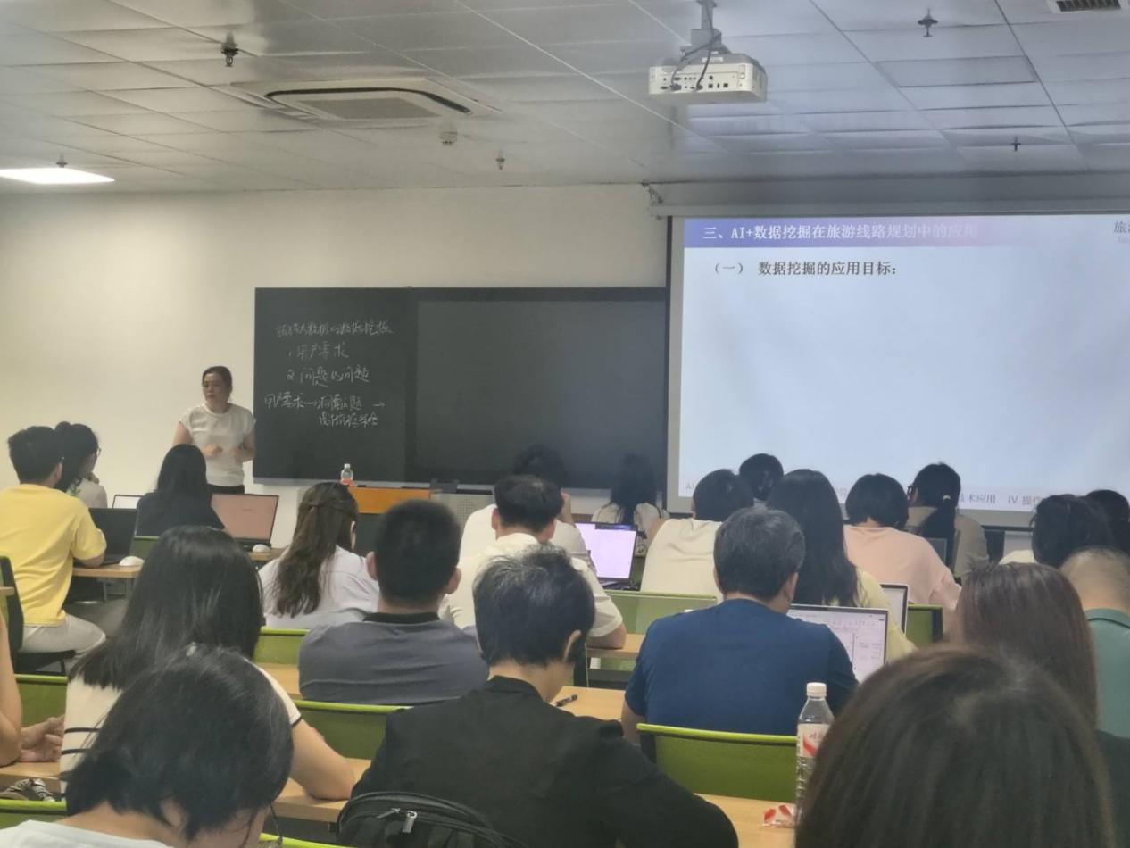 本次课程创新采用“管理学+计算机科学”双师同堂模式,由学院张睿教授与于海涛副教授联袂授课。聚焦AI与数据挖掘技术在旅游领域的实际应用,于海涛提出“5W1H提示词构造工程”,助力文科生无代码完成旅游大数据分析。课堂上,师生基于3000条真实旅游数据,探究线路销量、好评影响因素及目的地关联性,以解决旅行社实际需求为目标开展探究式教学。