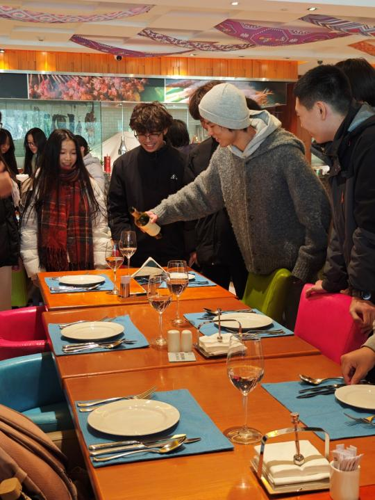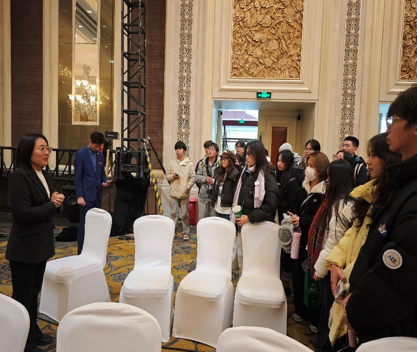作为桂北高端酒店标杆,香格里拉酒店以 “自然美学 + 精致服务” 著称,此次实习围绕酒店管理核心运营模块展开。下午 2 时起,学生分两组参观了酒店大宴会厅、中西餐厅等区域,直观感受高端酒店的空间设计与场景运营。在酒店西餐厅,同学们学习了西餐服务知识,并以分组竞赛形式开展摆台折口布实操,体验西餐服务技能细节。并通过茶歇环节的精致服务,让同学们体会到高端酒店的服务品质和标准。随后,客房部负责人为同学们详细讲解并演示了客房智能功能与标准化查房过程,还原了智慧化客房运营的全流程。