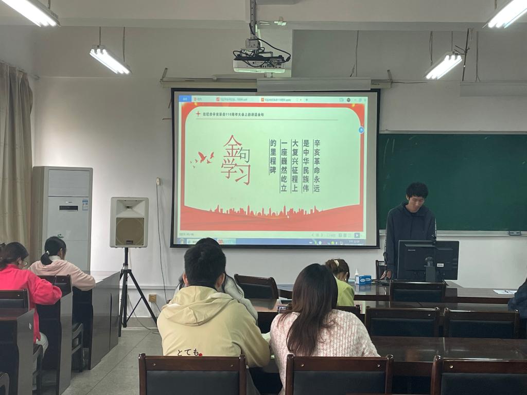 会上,贾恒存围绕习近平总书记在纪念辛亥革命110周年大会上的重要讲话,从辛亥革命的历史功绩及重大意义、中国共产党人在孙中山先生革命事业中所扮演的角色、辛亥革命110年来的历史启示、实现祖国统一和中华民族伟大复兴以及习近平总书记在纪念辛亥革命110周年大会上的讲话金句等方面展开讲解,并在会后同全体党员展开讨论,作为学生党员,要深刻领会习近平总书记重要讲话精神,秉承先驱遗志,以史为鉴、砥砺奋进。