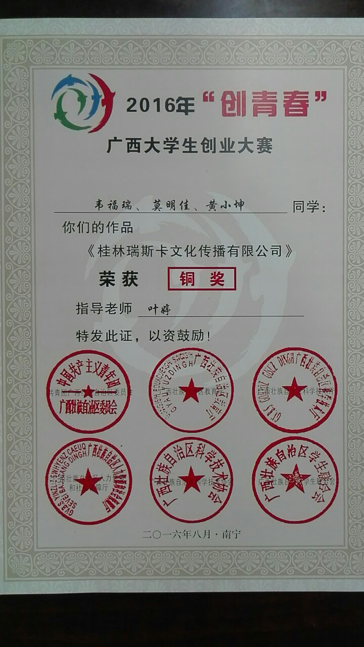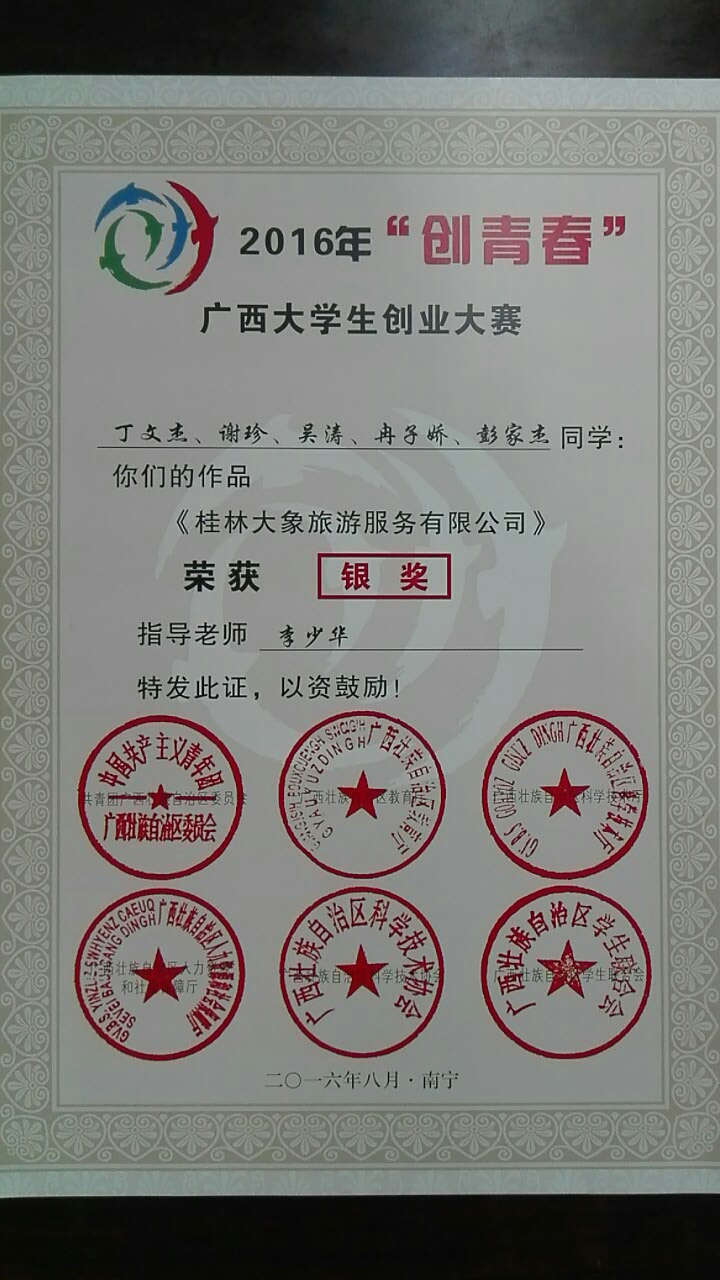 日前,2016年“创青春”中航工业全国大学生创业大赛终审决赛在电子科技大学举行。经过激烈角逐,由旅游学院选送,李少华老师指导,丁文杰、谢珍、吴涛、冉子娇、彭家杰等同学完成的《桂林大象旅游服务有限公司》获得全国铜奖;由叶婷老师指导,韦福瑞、莫明佳、黄小坤等同学完成的《桂林瑞斯卡文化传播有限公司》获得广西赛区铜奖。