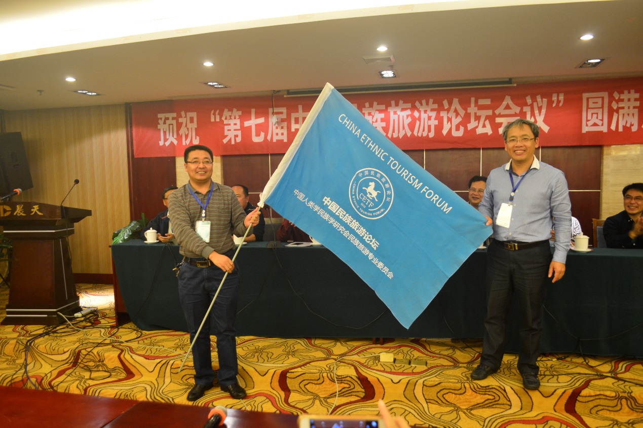 紧接着,beats365亚洲版院长吴忠军教授与下一届,即第八届中国民族旅游论坛的承办单位代表——西北师范大学旅游学院副院长梁旺兵教授交接了中国民族旅游论坛的会旗。交接仪式结束后,梁旺兵发言。他首先介绍了西北师范大学旅游学院的基本情况,表示民族旅游已成为西北师大旅游学院的研究特色之一。并且指出,甘肃有55个少数民族,其中包括裕固、保安、东乡3个特有民族,并且拥有1个自治州(甘南藏族自治州)、7个民族自治县,是符合举办下一届中国民族旅游论坛基本条件的,并热情邀请与会代表明年赴甘肃交流、考察。