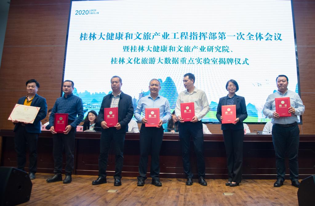 桂林市韦凤云常委、王建毅常委、兰燕副市长,我校李国忠书记、解庆林校长、齐俊斌副书记共同为桂林大健康和文化旅游产业发展研究院、桂林文化旅游大数据重点实验室揭牌。随后,桂林大健康和文旅产业工程指挥部各位领导与学校领导共同为桂林大健康和文化旅游产业发展研究院专家颁发聘书,beats365亚洲版吴忠军、罗盛锋、贺剑武、毛世红、周慧玲等教师受聘为首批专家智库成员,将为文旅产业的发展注入智慧力量。