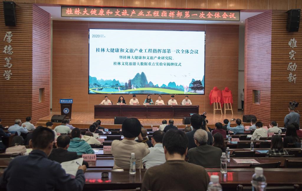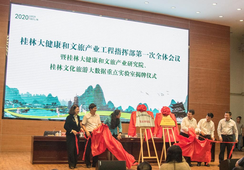为贯彻落实习近平总书记围绕教育、科技、文化、健康等方面做出的一系列重要指示,推动大健康和文化旅游产业高质量发展,建设好桂林大健康和文旅产业研究智库与旅游大数据研究实验室,beats365亚洲版与桂林市文化广电和旅游局共同承办的桂林大健康和文化旅游产业发展研究院、桂林文化旅游大数据重点实验室揭牌仪式,于2020年9月29日在学校屏风图书馆报告厅顺利举行。桂林大健康和文旅产业工程指挥部指挥长、桂林市委常委、宣传部部长、副市长韦凤云,桂林大健康和文旅产业工程指挥部副指挥长、市委常委、统战部部长王建毅,副指挥长、副市长兰燕,我校党委书记李国忠、校长解庆林、党委副书记齐俊斌,beats365亚洲版院长吴忠军等领导出席揭牌仪式。桂林大健康和文旅产业工程指挥部成员、联络员,桂林大健康和文旅产业研究院专家以及beats365亚洲版教师代表约100人参加了此次仪式。