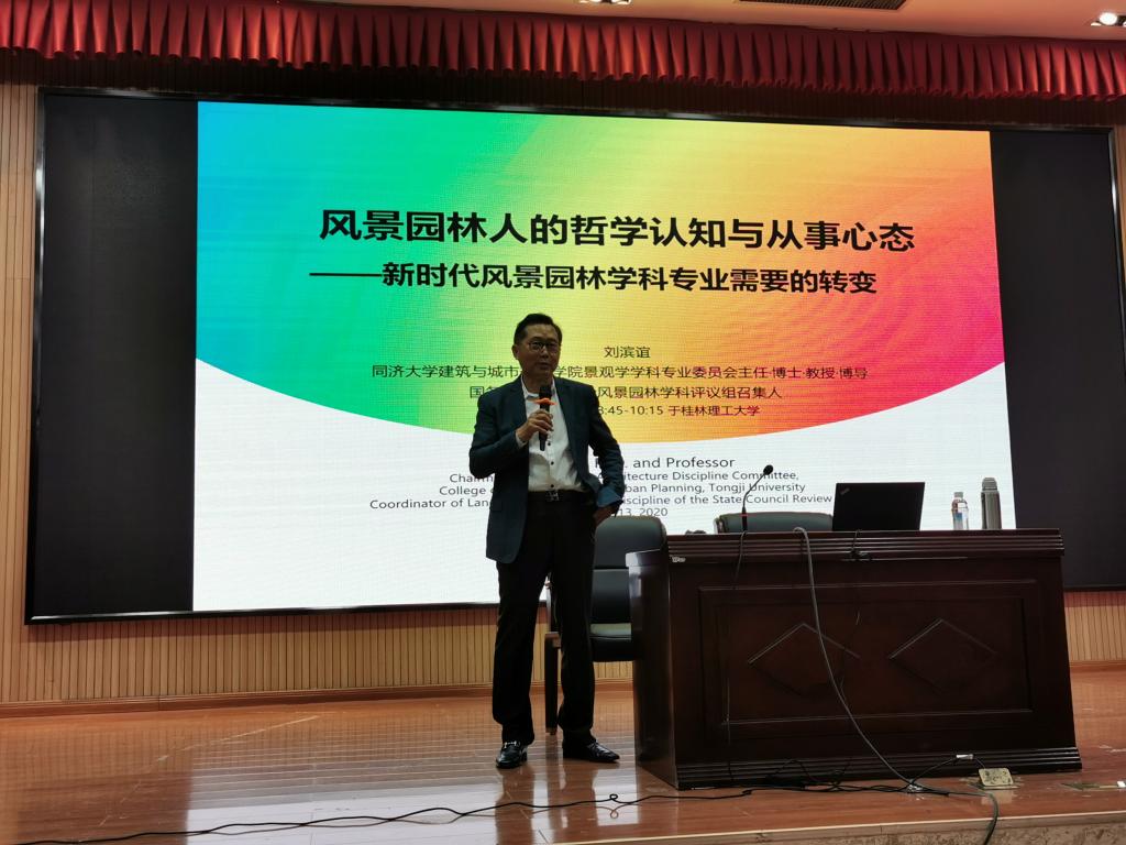 11月13日上午,国务院学位办风景园林学科评议组召集人、全国高等院校风景园林学科专业指导委员会副主任委员、同济大学建筑与城市规划学院刘滨谊教授在我校雁山校区图书馆报告厅作了题为《风景园林人的哲学认知与从事心态》的精彩学术报告。我校相关专业师生聆听了此次报告。