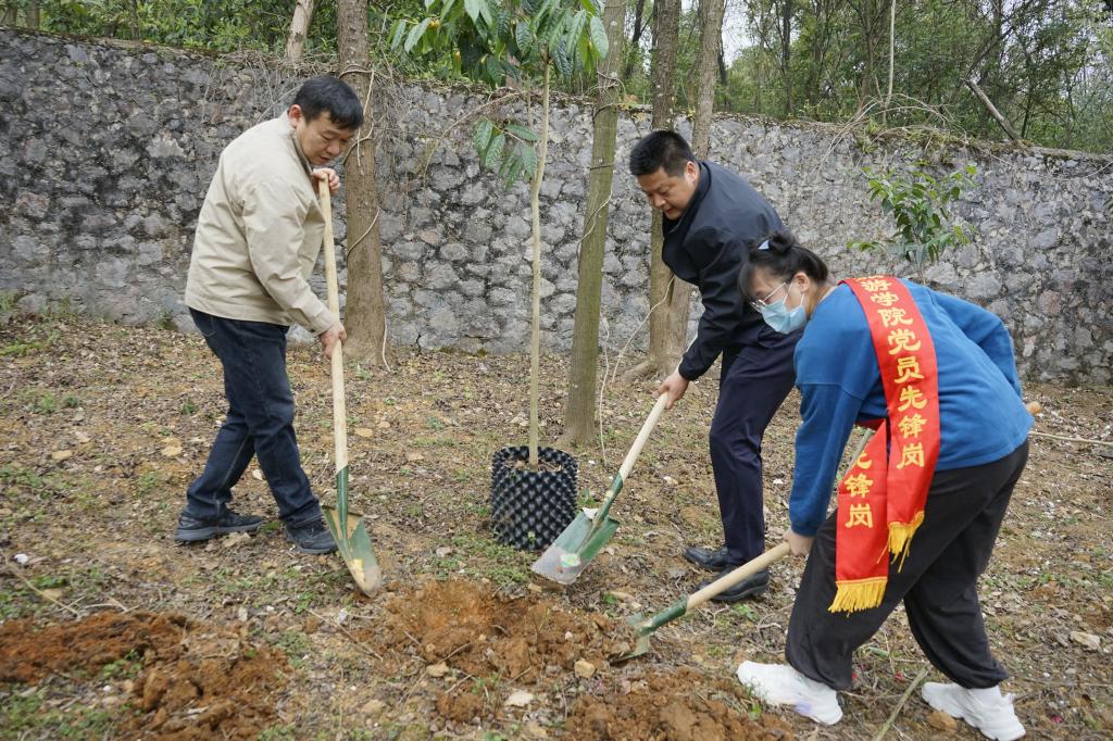植树现场,全体师生热情高涨,挥锹铲土、扶苗、培土、踩实、浇水灌溉,充分发扬不怕脏、不怕累精神,齐心协力共栽金花茶和红花檵木30余株。