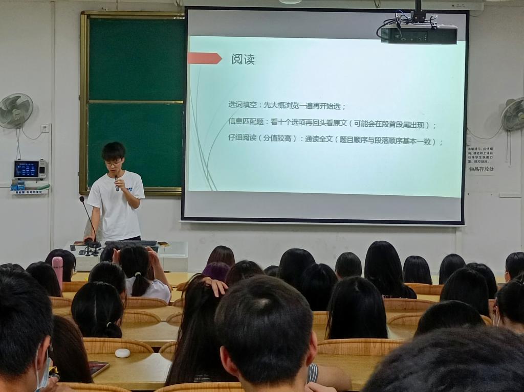 交流会中,学长学姐准备了满满的干货,从四六级听力、阅读理解、翻译和作文等方面进行了详细的阐述,提供答题技巧。他们毫无保留地分享自己的经验,为到场学生指点迷津。会后,学生们还建立起线上指导沟通渠道,长期联系帮扶。