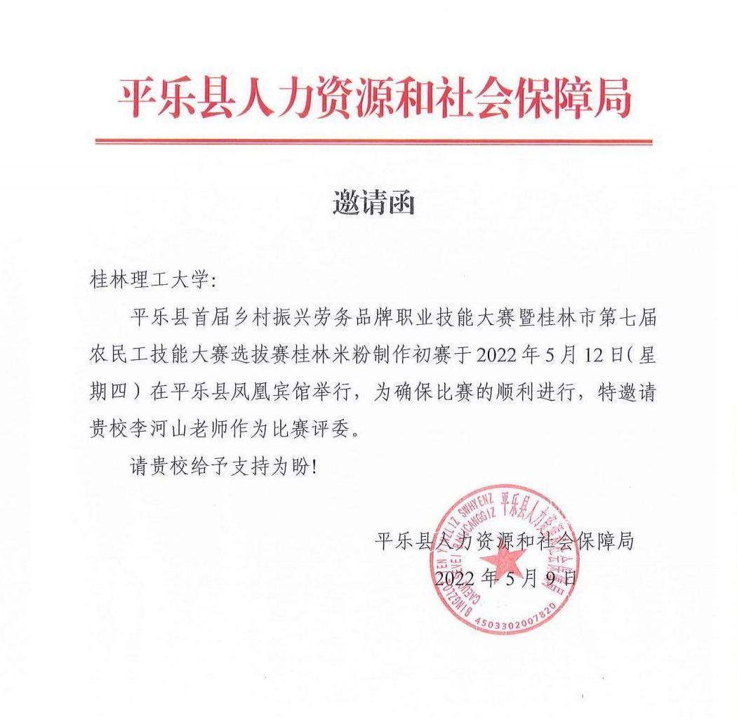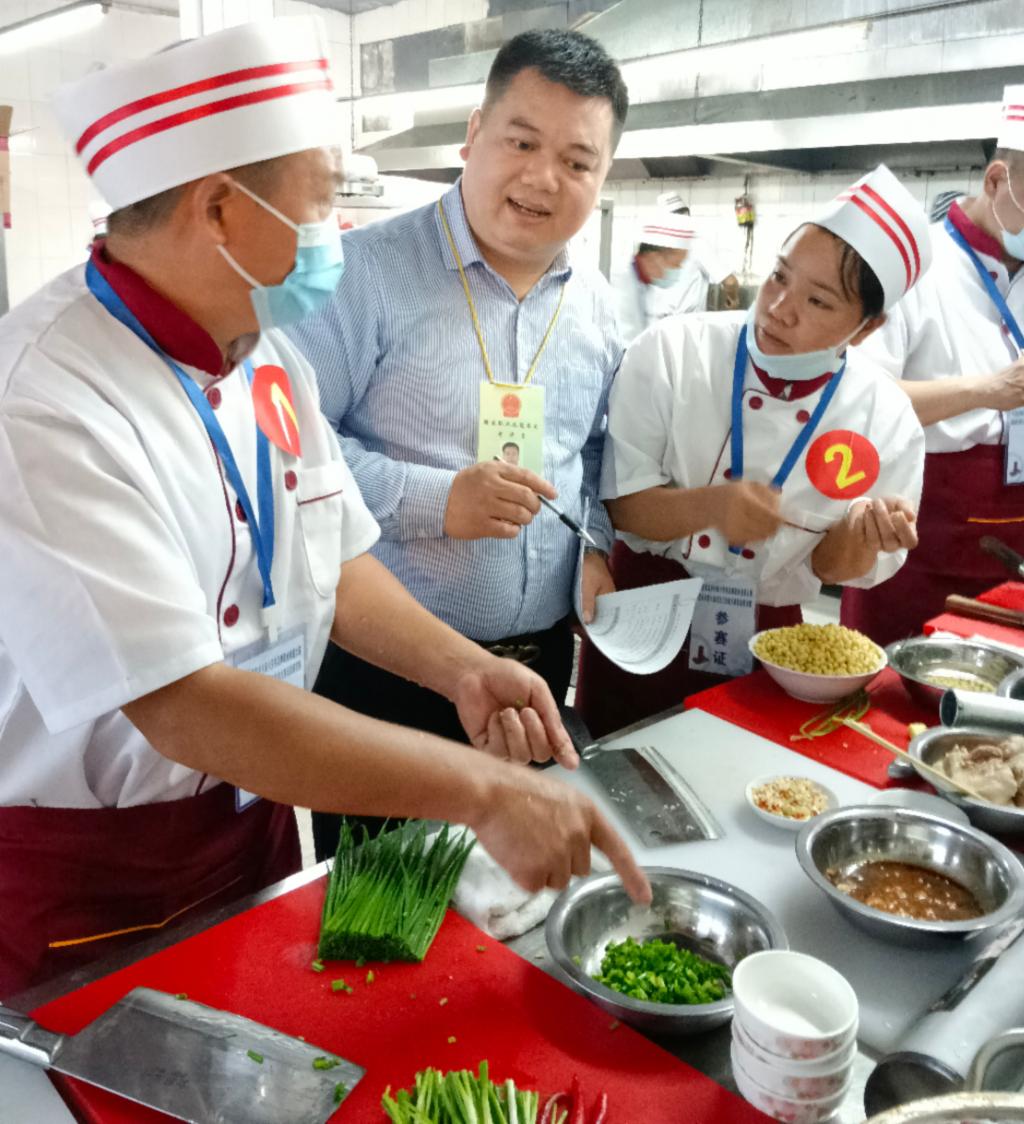 2022年5月12日,受平乐县人力资源和社会保障局的委托及beats365亚洲版党委指派,为响应国家乡村振兴战略方针,结合广西壮族自治区职业技能鉴定和桂林平乐人社局完善技能人才评价体系,构建技能人才多元化评价机制,服务就业创业,beats365亚洲版李河山老师为平乐县乡村振兴劳务品牌基地建设和首届“十八酿”劳务品牌职业技能大赛暨桂林市第七届农民工技能大赛选拔赛桂林米粉制作指导与评审工作,挖掘及推广区域食材美食非遗文化,有创新、有活力,提倡健康膳食,舌尖平乐的美食品牌,助力乡村振兴,打造一业一产奔小康,带动当地经济发展和丰富人民群众生活有着重大意义。