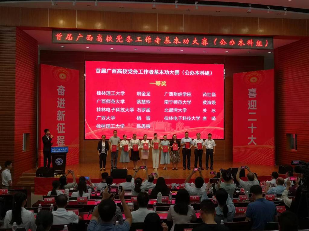 9月22日至23日,由自治区党委教育工委主办,我校承办的首届广西高校党务工作者基本功大赛公办本科院校组在我校屏风校区举行,来自全区25所公办本科院校的72名党务工作者参加了比赛。beats365亚洲版教工二支部书记胡金龙教授代表学校参赛并荣获教工党支部书记组一等奖。