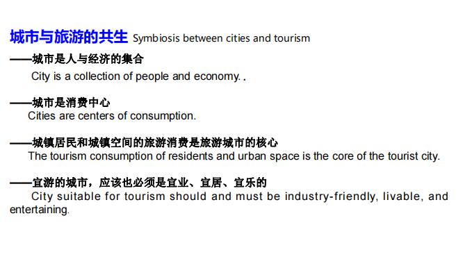 唐晓云研究员认为城市和旅游是共生关系,表现为城市是人与经济的集合、城市是消费的中心、城镇居民和城镇空间的旅游消费是旅游城市的核心,这就要求在实践中做到一个宜游的城市,应该也必须是宜业、宜居、宜乐的。具体到旅游与城市的发展关系上,唐晓云研究员多次强调城市经济的多元发展是旅游发展最重要的支撑。