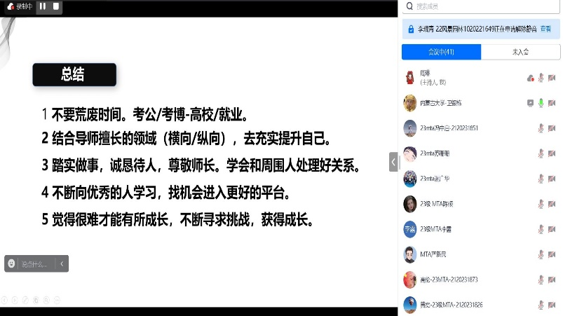 本次讲座主题明确,内容丰富,卫银栋老师对学生们的提问提供了详细的解答。通过卫银栋老师的解答,同学们对研究生学习有了更清晰的规划和认识。本次讲座是新生入学教育系列讲座之一,讲座也拓展了线上线下虚拟教学建设的新内容。