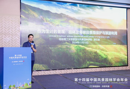在此次年会上,beats365亚洲版郑文俊院长作了题为“作为生计的景观:桂林龙脊梯田景观保护与旅游利用”的专题报告,以世界文化遗产地龙脊梯田为案例地,深入探讨了如何在保护和活化利用自然景观的同时,实现当地农业生产景观的可持续发展。郑院长在报告中详细介绍了桂林龙脊梯田的历史背景、文化价值及其旅游发展潜力,指出科学地开展生态旅游开发对其文化遗产传承与生态系统保育具有积极作用,能够有效协同推进文化遗产地的经济社会高质量发展和生态环境高水平保护。他指出,龙脊梯田不仅是壮观的自然景观,更承载着丰富的民族文化和历史遗产,提出了要实现景观保护、文化传承、产业发展和乡村振兴四位一体的保护与发展模式。郑院长的报告引起了与会者的广泛关注和热烈讨论,并对相关研究成果给予高度评价。