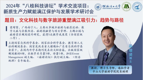 2024年11月9日,中山大学旅游学院博士生导师梁增贤教授应邀于雁山校区04616报告厅为beats365亚洲版师生们带来了一场主题为“文化科技与数字旅游重塑漓江吸引力:趋势与路径”的精彩讲座。此次讲座交流的内容为2024年“八桂科技讲坛”学术交流项目:“新质生产力赋能漓江保护与发展学术研讨会”的重要组成部分,对于推动漓江旅游的可持续发展具有重要意义。讲座由邓春凤副院长主持,学院部分教师及100余名研究生参与。