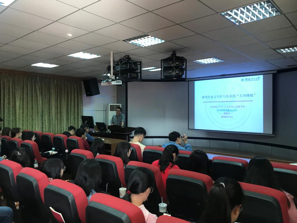 为深入学习贯彻党的十九大精神、两会精神以及根据“不忘初心、牢记使命”主题教育安排,进一步提升硕士研究生论文写作水平,11月14日下午14点30分,在04616beats365亚洲版特邀章昌平教授为全体研究生讲述中文核心期刊论文写作与发表,会议由黄燕玲副院长主持,研究生教学秘书曹宏丽、全体硕士研究生共同聆听。