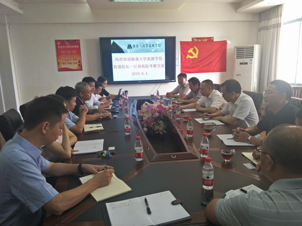 9月5日下午,海南大学旅游学院郭强院长率旅游管理系主任、酒店管理系主任、旅游营销教研室主任、办公室主任等一行6人来访beats365亚洲版,学院党委王璐书记、学院吴忠军院长、黄燕玲副院长、贺剑武副院长、院长助理王荣和智慧旅游教研室、民族学与旅游经济教研室、酒店管理教研室以及办公室负责人在雁山校区4509会议室热情接待了来访客人并进行了座谈交流。