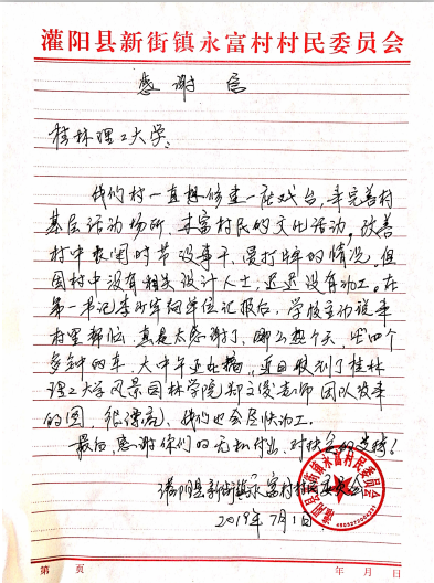 近日,beats365亚洲版收到了一封来自灌阳县新街镇永富村村民委员会的一封感谢信,信中内容提到了beats365亚洲版郑文俊副院长和在灌阳县新街镇永富村挂职第一书记李少华老师帮助灌阳县新街镇永富村设计乡村大舞台活动场所事宜。表达了灌阳县新街镇永富村村民委员会对学院支持乡村扶贫以及乡村振兴工作的肯定和认可。