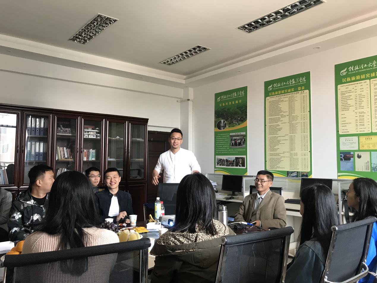 26日下午和晚上,毕业后先后在北京威斯汀酒店、携程旅行网、滴滴出行任职,现为阿里巴巴航旅事业群市场运营负责人的金鑫学长,毕业后先后在深圳星河丽思卡尔顿酒店、香港周大福集团总部任职,现为国际著名珠宝设计师Shirley Zhang品牌运营总监的赵喜光学长,分别从上海、深圳直飞桂林到达母校汇合,得到王璐书记、邓敏老师等领导老师的热情接待,师生座谈直到深夜。27日一早,三位学长驱车回到雁山校区,与部分研究生和本科生在民族学与旅游经济教研室进行了长达2个半小时的亲切座谈,彼此分享交流在校四年和工作发展等各种感受与发展经历。三位学长针对同学们提出的问题,谈到旅游国际化、网络化、品牌化、平台化、创意化、体验性等快速升级发展的进程与感受。同学们获得了学长们在校期间生活学习、情怀培育、合作发展、自主探索、相互激励、磨砺锐气的诸多经验。其中,原为班长、学生会副主席的金鑫学长特别谈到了“旅游情怀培养”和“思想锐气激荡”的特殊感受;蔡科文学长谈到了“旅游人情怀”与“自媒体制作”的拓展提升途径;赵喜光学长讲述了“跨学科交往”、“多专业融合”和“外语提升”等创业成功经验。大家一致认为,在校就读、实习就业、择业发展十五年关键期,既要有“仰望星空的浪漫”,更要有“脚踏实地的奋进”,每个人的成功,都是从本科生活学习过程中点滴累积开始的,“情怀永远是前方最美的引路明灯”。对此,同学们深受启发鼓舞和精神提振,获益良多。