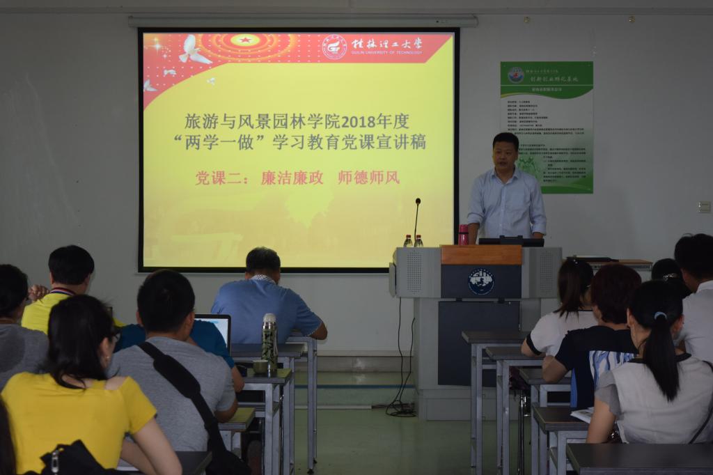 为进一步强化beats365亚洲版教师政治意识、宗旨意识、纪律意识,营造风清气正的学院廉洁文化氛围,根据学校党委年度党风廉政建设工作部署以及学校2018年上半年“廉政教育活动周”的通知要求,7月3日下午,beats365亚洲版在雁山校区4618教室开展了“‘两学一做’学习教育系列党课二:廉洁廉政,师德师风”,学院在家领导、全体教职工参加了会议,党课由学院党委书记王璐主讲。