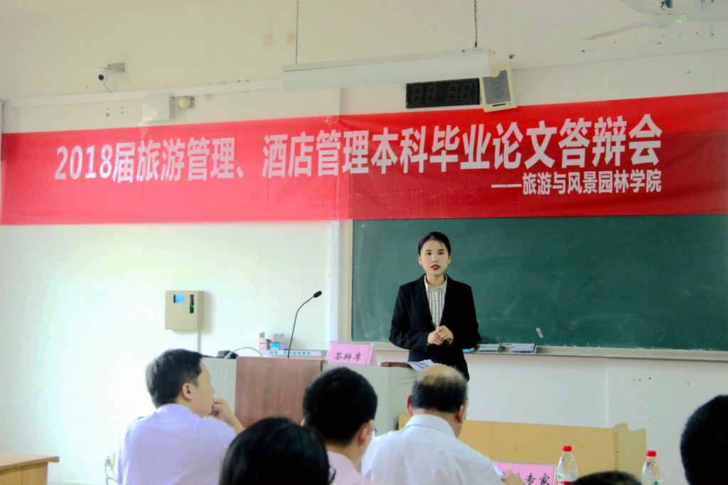 2018年6月2日,旅游与风景园林学院在雁山校区6号教学楼分组举行了旅游管理、酒店管理和风景园林专业2018届本科毕业答辩会。为提高本科生的论文水平,保障答辩质量,旅游与风景园林学院专门成立了由55名教师和17名外聘专家组成的本科论文答辩委员会。特别邀请了桂林旅游学院高元衡副教授、桂林市城市规划设计研究院何源高级工程师、桂林灵渠旅游开发有限公司任仲平总经理、桂林大银工坊孔伟总经理等17名旅游行业的专家和高级管理者作为答辩委员会外聘专家。旅游管理、酒店管理和风景园林专业共376名本科毕业生参加了此次答辩。