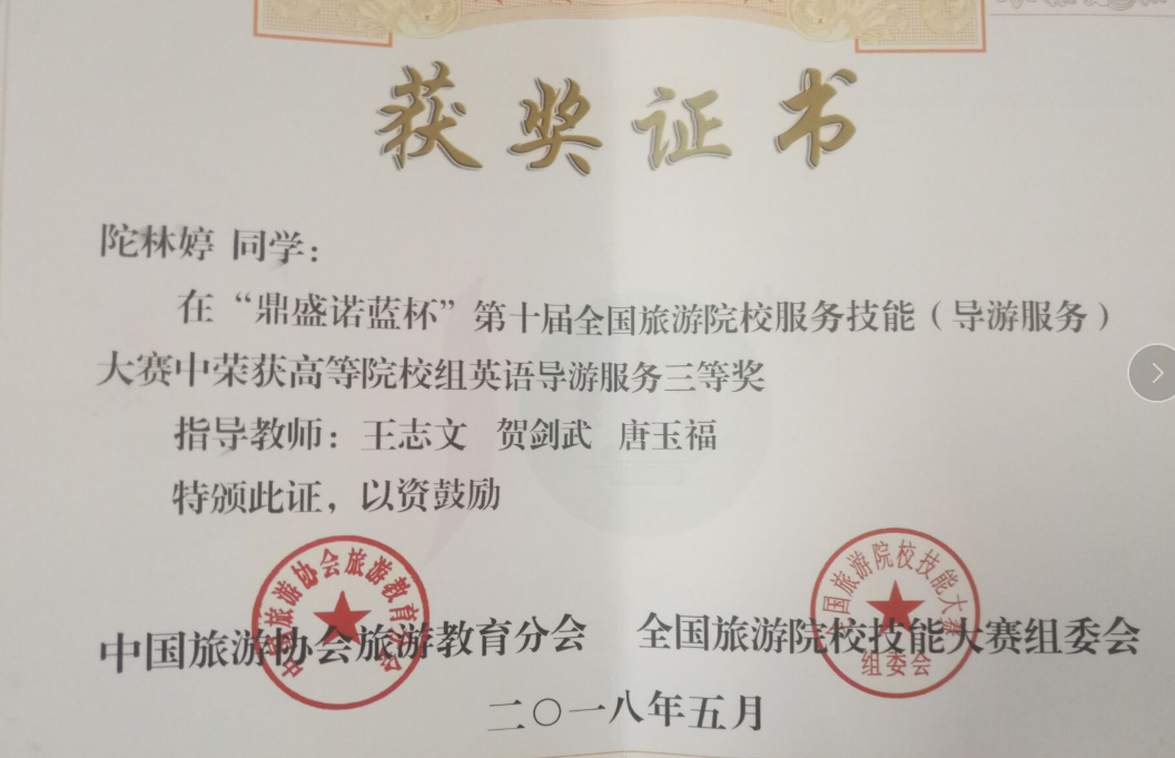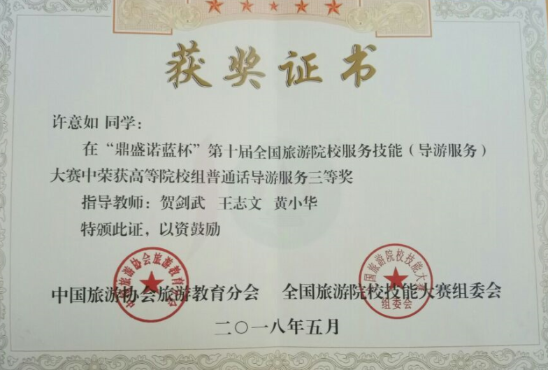 由中国旅游协会旅游教育分会、教育部学校规划建设发展中心、浙江省旅游局联合主办的“鼎盛诺蓝杯”第十届全国旅游院校服务技能(导游服务)大赛于5月10日—13日在浙江旅游职业学院举行,大赛展示了近年来我国旅游专业建设的成果,为旅游院校和社会各界搭建了交流的平台,受到广泛关注。