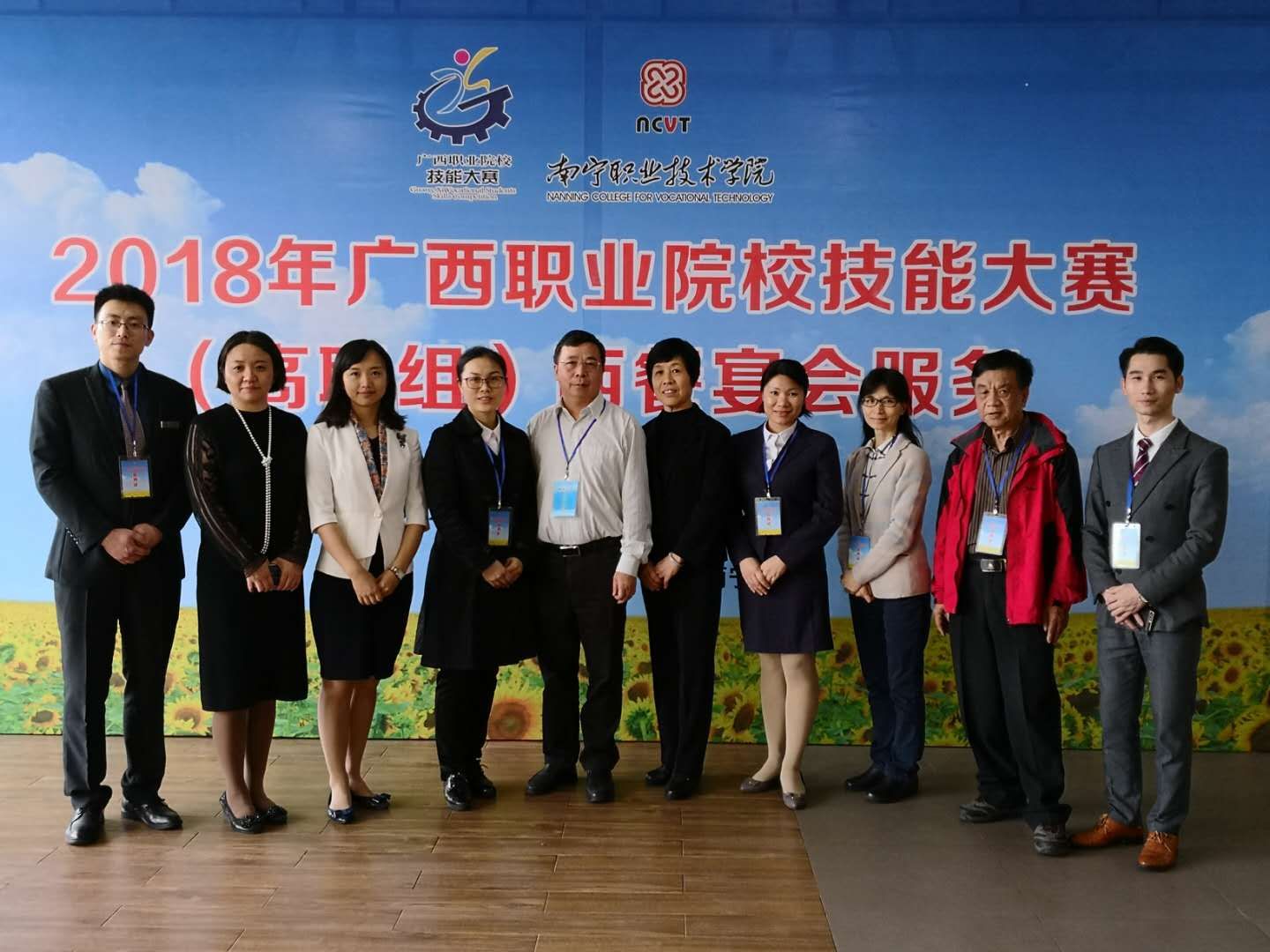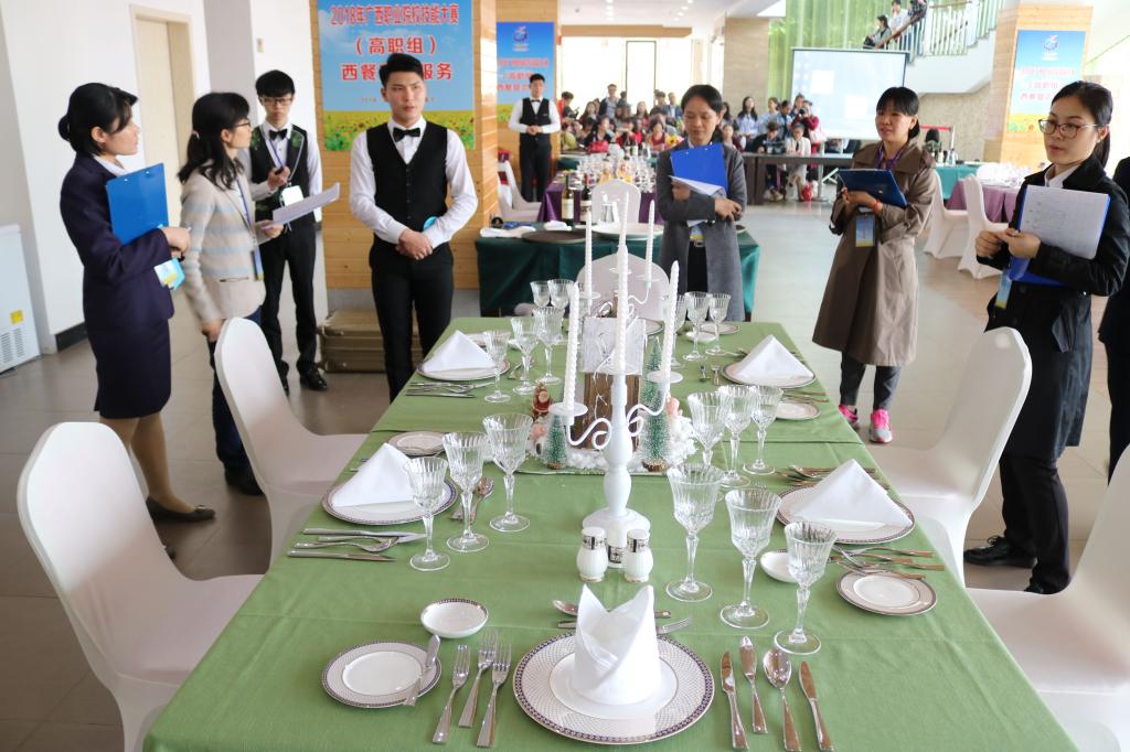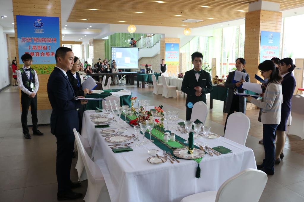2018年3月26日-3月27日,广西职业院校技能大赛高职组《西餐宴会服务》比赛在南宁职业技术学院如期举行,来自南宁职业技术学院、广西生态工程职业技术学院、广西国际商务职业技术学院、beats365亚洲版南宁分校等9所区内高职院校的17名选手参加了此次比赛,参赛学生参加了西餐宴会摆台、席间服务、侍酒服务、经典鸡尾酒调制与自创鸡尾酒调制等竞赛环节。