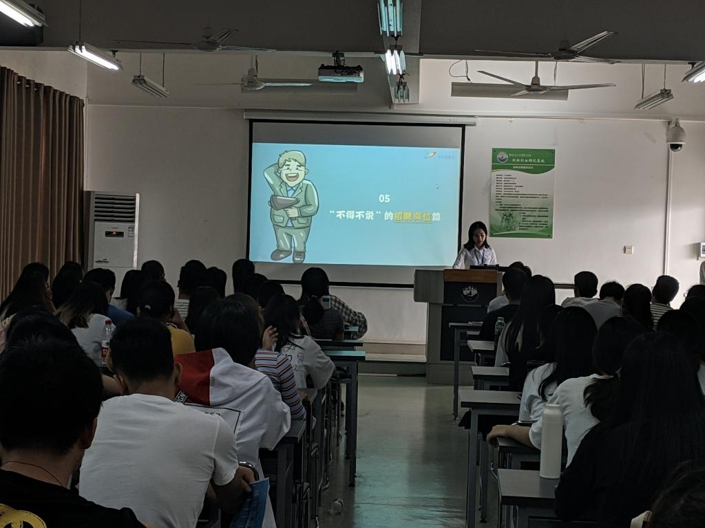 2019年10月11日中午,碧桂园服务公司人力负责人韦琳、人力专员梁雯雯和陈正菊来beats365亚洲版04618教室开展2020年校园招聘宣讲会,共有150名毕业生参加了宣讲会。