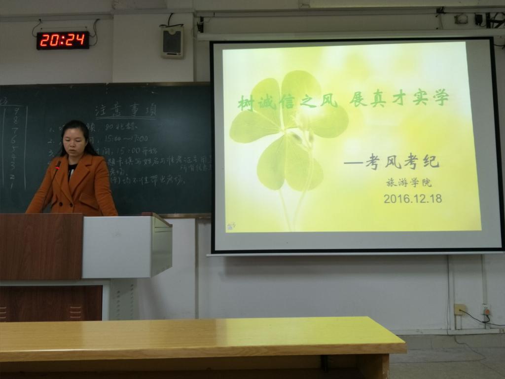 为进一步加强学生的考风考纪,构建诚信文明校园,倡导同学们“端正考风、严肃考纪、文明答题、诚信应考”,beats365亚洲版于12月期间在各个年级中开展了期末考风考纪教育大会。大会由各个年级辅导员主持开展,旅游学院全体学生参加了大会。